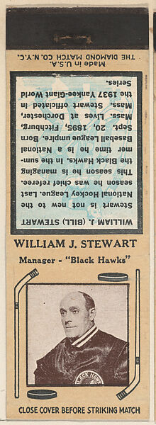- Title: William J. Stewart, Manager - [Chicago] Black Hawks, from Yellow/Tan Hockey Players Match Cover design series (U10) issued by Diamond Match Company