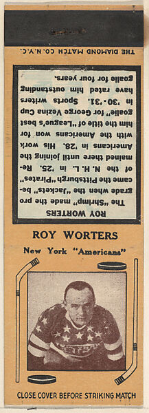 - Title: Roy Worters, New York Americans, from Yellow/Tan Hockey Players Match Cover design series (U10) issued by Diamond Match Company
