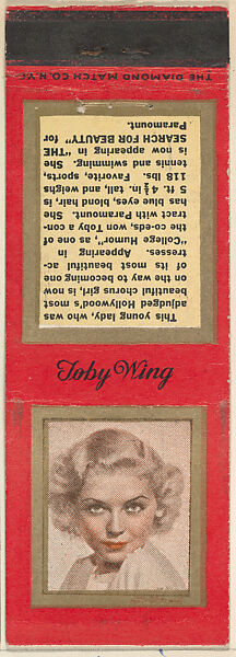 - Title:Toby Wing from Movie Stars Match Cover design series (U20) issued by Diamond Match Company