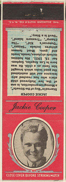 - Title:Jackie Cooper from Movie Stars Match Cover design series (U21) issued by Diamond Match Company