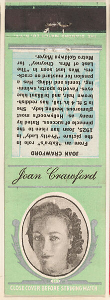 - Title: Joan Crawford from Movie Stars Match Cover design series (U21) issued by Diamond Match Company