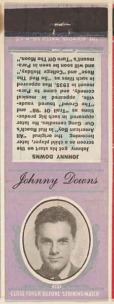 - Title: Johnny Downs from Movie Stars Match Cover design series (U21) issued by Diamond Match Company