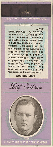 - Title:Leif Erikson from Movie Stars Match Cover design series (U21) issued by Diamond Match Company
