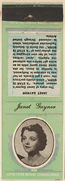 - Title: Janet Gaynor from Movie Stars Match Cover design series (U21) issued by Diamond Match Company