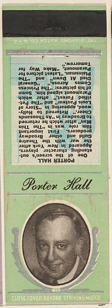 - Title: Porter Hall from Movie Stars Match Cover design series (U21) issued by Diamond Match Company