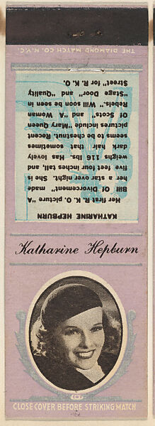 - Title:Katharine Hepburn from Movie Stars Match Cover design series (U21) issued by Diamond Match Company