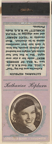 - Title: Katharine Hepburn from Movie Stars Match Cover design series (U21) issued by Diamond Match Company