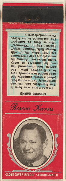 - Title: Roscoe Karns from Movie Stars Match Cover design series (U21) issued by Diamond Match Company