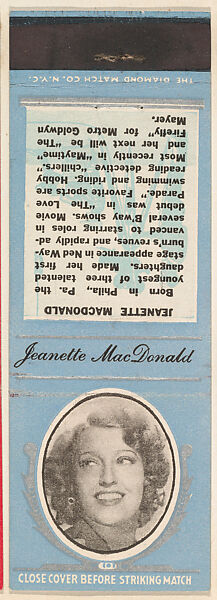 - Title:Jeanette MacDonald from Movie Stars Match Cover design series (U21) issued by Diamond Match Company