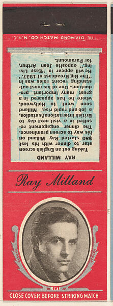 - Title: Ray Milland from Movie Stars Match Cover design series (U21) issued by Diamond Match Company
