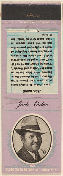 - Title:Jack Oakie from Movie Stars Match Cover design series (U21) issued by Diamond Match Company