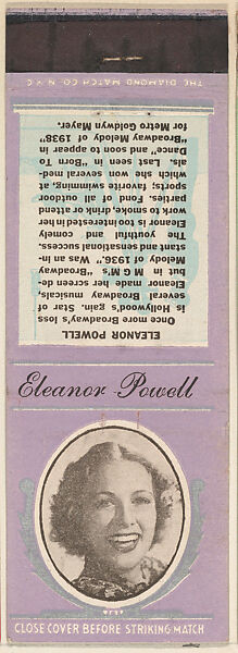 - Title: Eleanor Powell from Movie Stars Match Cover design series (U21) issued by Diamond Match Company