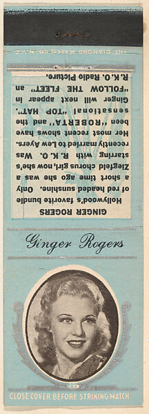 - Title: Ginger Rogers from Movie Stars Match Cover design series (U21) issued by Diamond Match Company