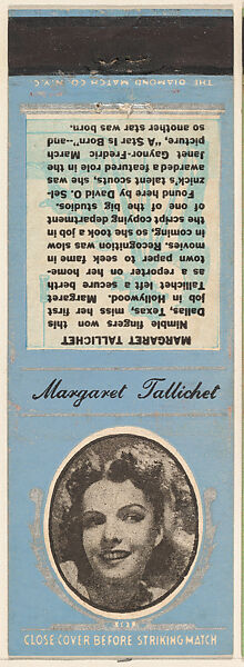 - Title: Margaret Tallichet from Movie Stars Match Cover design series (U21) issued by Diamond Match Company