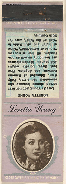 - Title: Loretta Young from Movie Stars Match Cover design series (U21) issued by Diamond Match Company