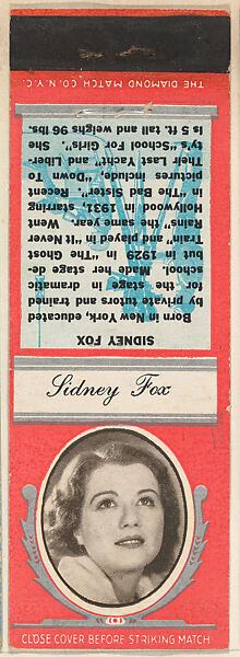- Title:Sidney Fox from Movie Stars Match Cover design series (U21) issued by Diamond Match Company
