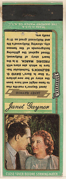 - Title: Janet Gaynor from Movie Stars Match Cover design series (U21) issued by Diamond Match Company