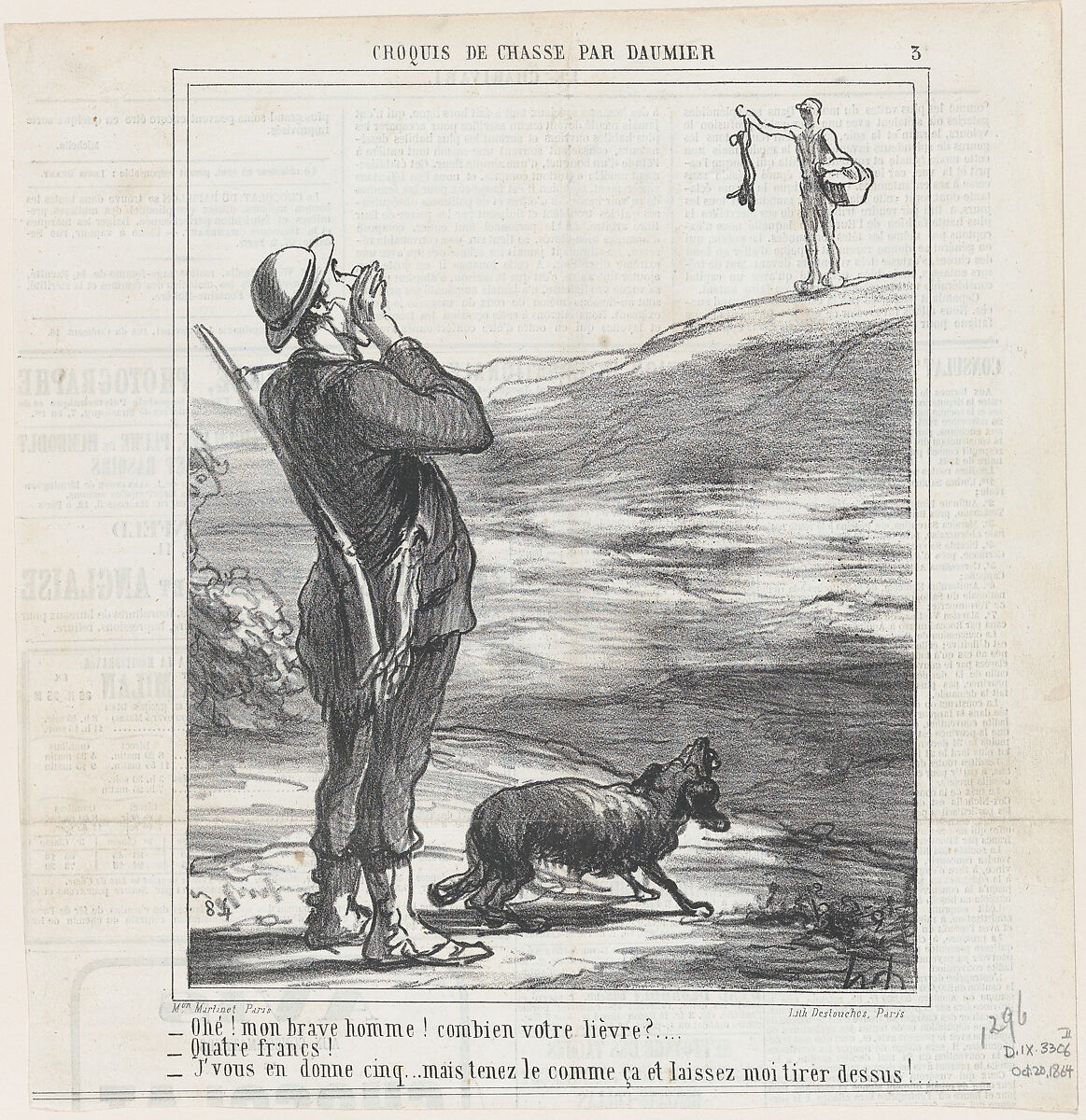 - Title: Hello! My good man! How much for your hare?, from 'Hunting sketches,' published in Le Charivari, October 20, 1864