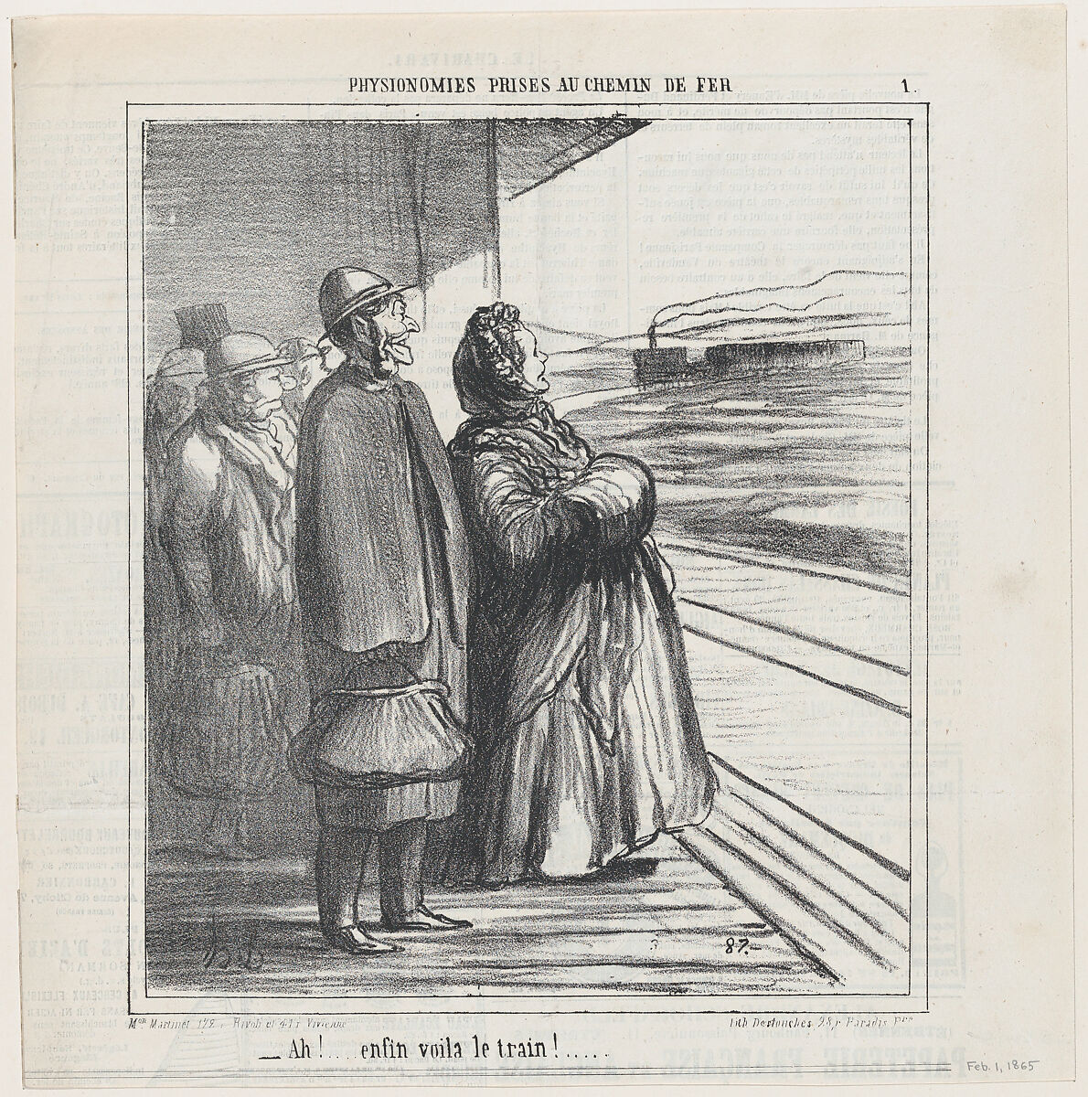 - Title: Finally! Here comes the train, from 'People on the train,' published in Le Charivari, February 1, 1865