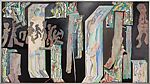 The Temple was created in the mid to late 1970s when Samant’s imagery and techniques became more complex. By 1975, he had begun to alter the surface of his paintings in a new and unusual way, attaching swatches of cut and folded paper that had been drawn and painted on. The attachments were labyrinths of raised, twisted, folded, cut and colored constructions. In The Temple, the paper cut outs alternate rhythmically with painted areas, which stand out as highly textured. The figures encased in rectangles resemble ancient Egyptian mummies, but also bring to mind Paul Klee’s Mural from the Temple of Longing ↖Thither↗, 1922 (MMA 1984.315.33).