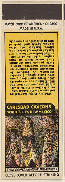 Matchbooks from Carlsbad Caverns, Souvenir Views Match Cover series (U40.2) produced ca. 1935–45 by Match Corp. of America, Chicago. Printed on saddle: CARLSBAD CAVERNS/ WHITE'S CITY, NEW MEXICO. Yellow color. Back includes a description of the park for visitors.