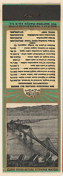 Matchbooks from San Francisco Bridges, Souvenir Views Match Cover series (U40.11) produced ca. 1935–45 by Diamond Match Company, New York. Printed on saddle in half circle: SOUVENIR. Green/gold or red/gold color. Back includes various facts about pictured bridge.