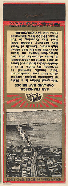 Matchbooks from San Francisco Bridges, Souvenir Views Match Cover series (U40.11) produced ca. 1935–45 by Diamond Match Company, New York. Printed on saddle in half circle: SOUVENIR. Green/gold or red/gold color. Back includes various facts about pictured bridge.