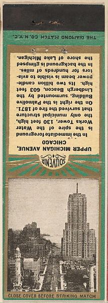 Matchbooks from Chicago, Souvenir Views Match Cover series (U40.3) produced ca. 1935–45 by Diamond Match Company, New York. Printed on saddle in half circle: SOUVENIR. Green/gold or red/gold color. Back includes description of particular local attraction or landmark.