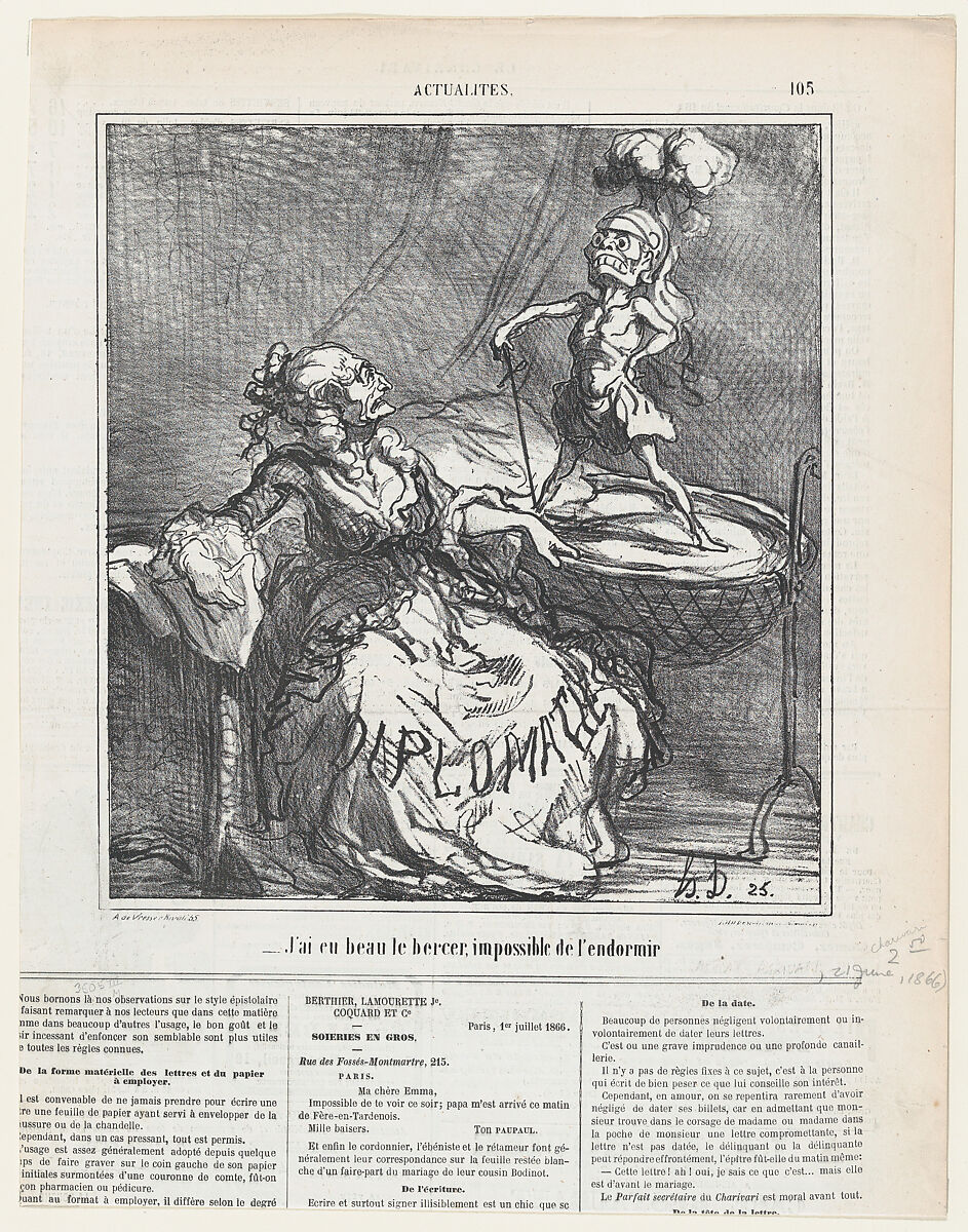 - Title: No matter how much I rock him, it is impossible to make him fall asleep, from 'News of the day,' published in Le Charivari, June 21, 1866