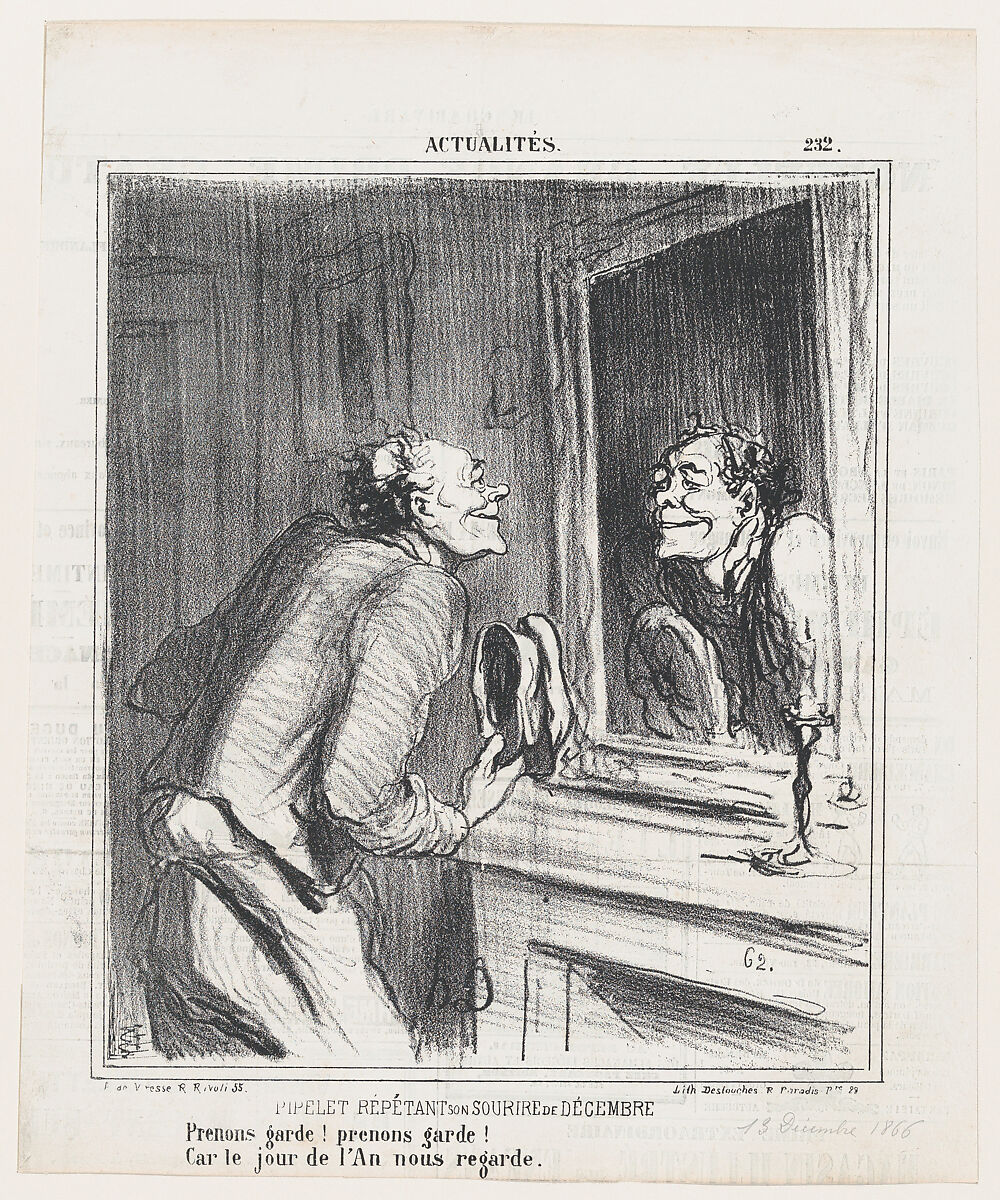 - Title: The concierge rehearsing his December smile: Take care! take care! For New Year's Day is approaching!, from 'News of the day,' published in Le Charivari, December 13, 1866