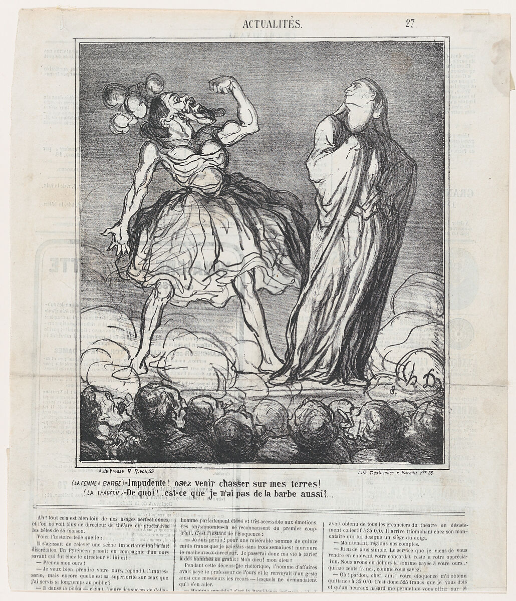 The bearded lady: Imprudent woman! You dare hunt on my territory! Tragedy: What! Don't I have a beard as well?, from 'News of the day,' published in Le Charivari, February 16, 1867