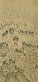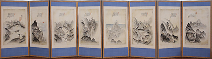 This work of art was on loan to the museum and has since been returned to its lender.Hallmarks of folk images of Mount Geumgang, as exemplified by this screen, are schematized style and composition. In this mesmerizing painting, the insistent repetition of bony white peaks, articulated in scrabbly outlines without added details or surface inflections, unifies the composition across the noncontinuous panels. The interplay in most scenes of the peculiar peaks with the rolling hills studded with pines alludes to a juxtaposition established by Jeong Seon a century earlier. Although the screen’s stylization seems quite removed from that of the eighteenth-century master, its articulation of the earthen hills—with washes and short horizontal strokes—echoes Jeong’s prototype, demonstrating the endurance of established traditions in representations of the Diamond Mountains.