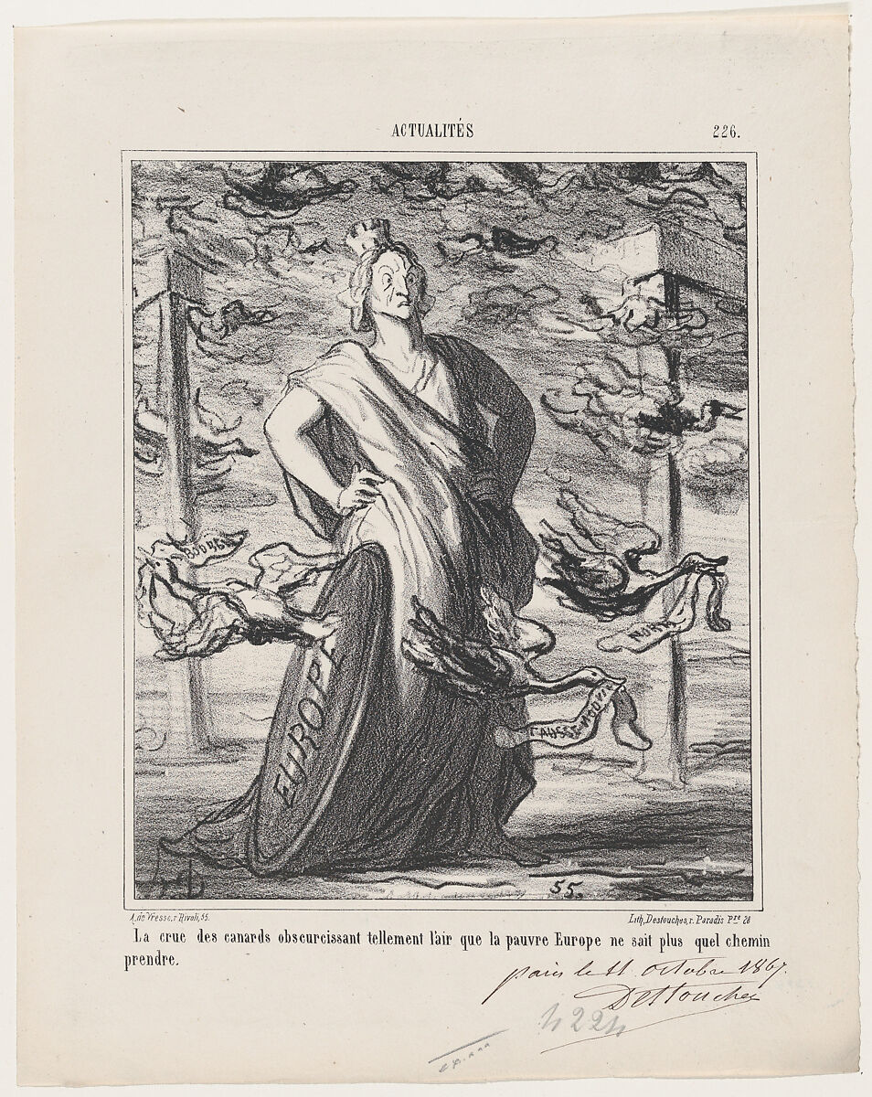 - Title: The cloud of ducks obscures the sky so much that poor Europe does not know what road to take, from 'News of the day,' published in Le Charivari, October 22, 1867