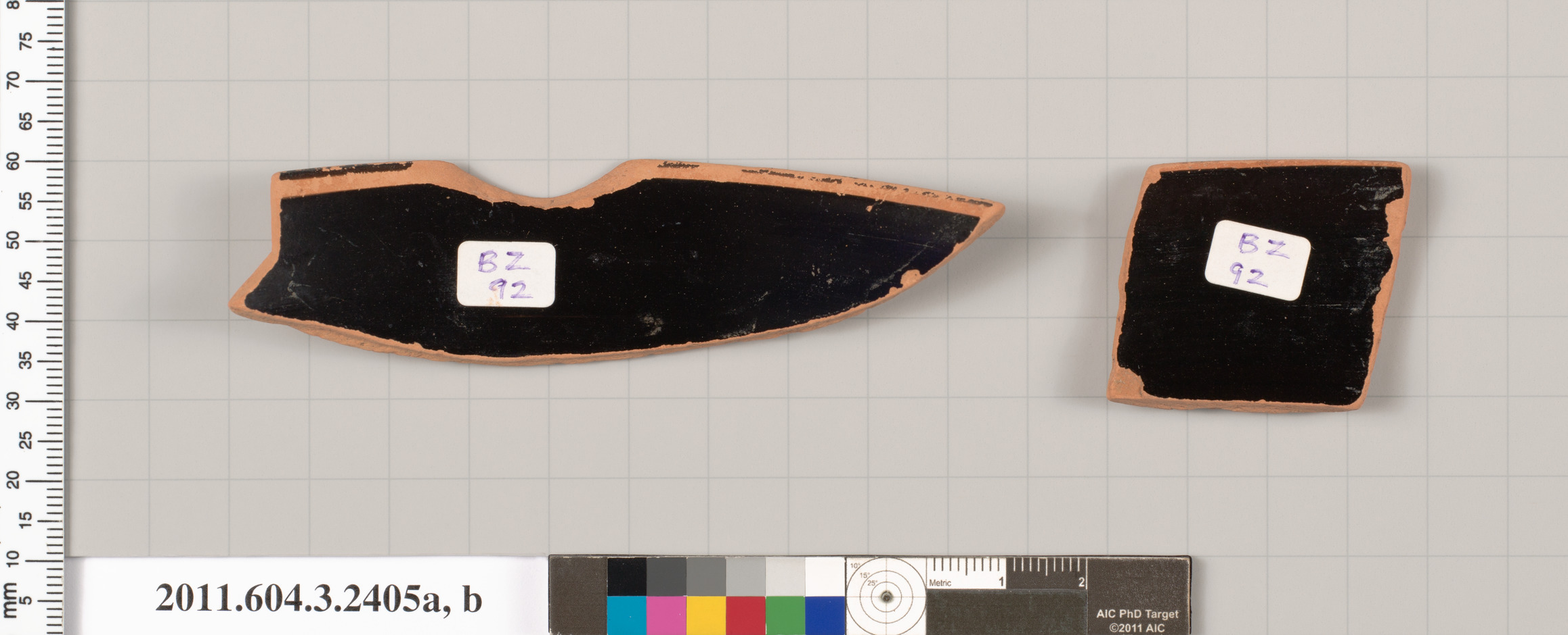 - Title: Terracotta rim fragments of a kylix: eye-cup (drinking cup)