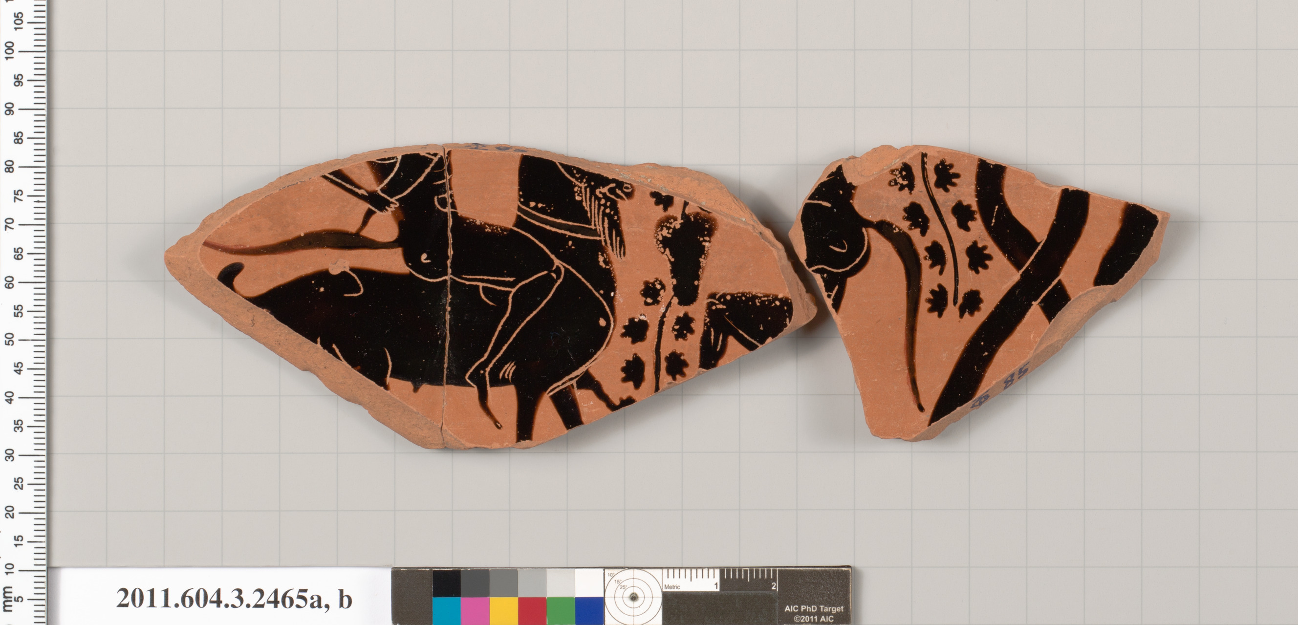 Interior, the larger fragment has a satyr riding a goat to right; part of a vine with a bunch of grapes; bent leg of a male (satyr?) to left; a second fragment has part of the lower back, buttocks, tail, and part of the upper right thigh of a satyr to left; part of a vine; Exterior, the larger fragment shows the legs and part of the tail of a satyr to left; part of an eye with a black, white, and red oculus; the smaller fragment has the waist, buttocks, bit of the right hand and left forearm and hand of a maenad wearing a garment with a rosette and a patterned hem