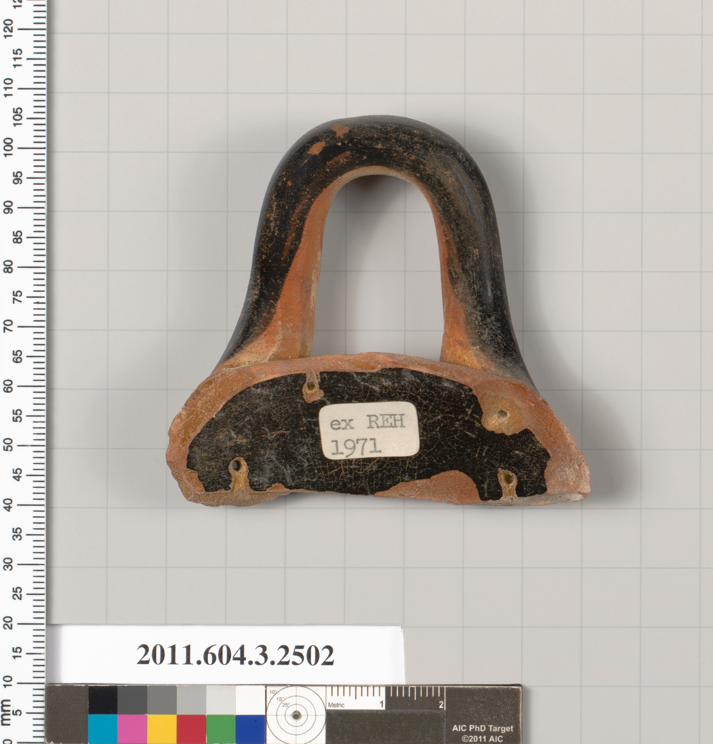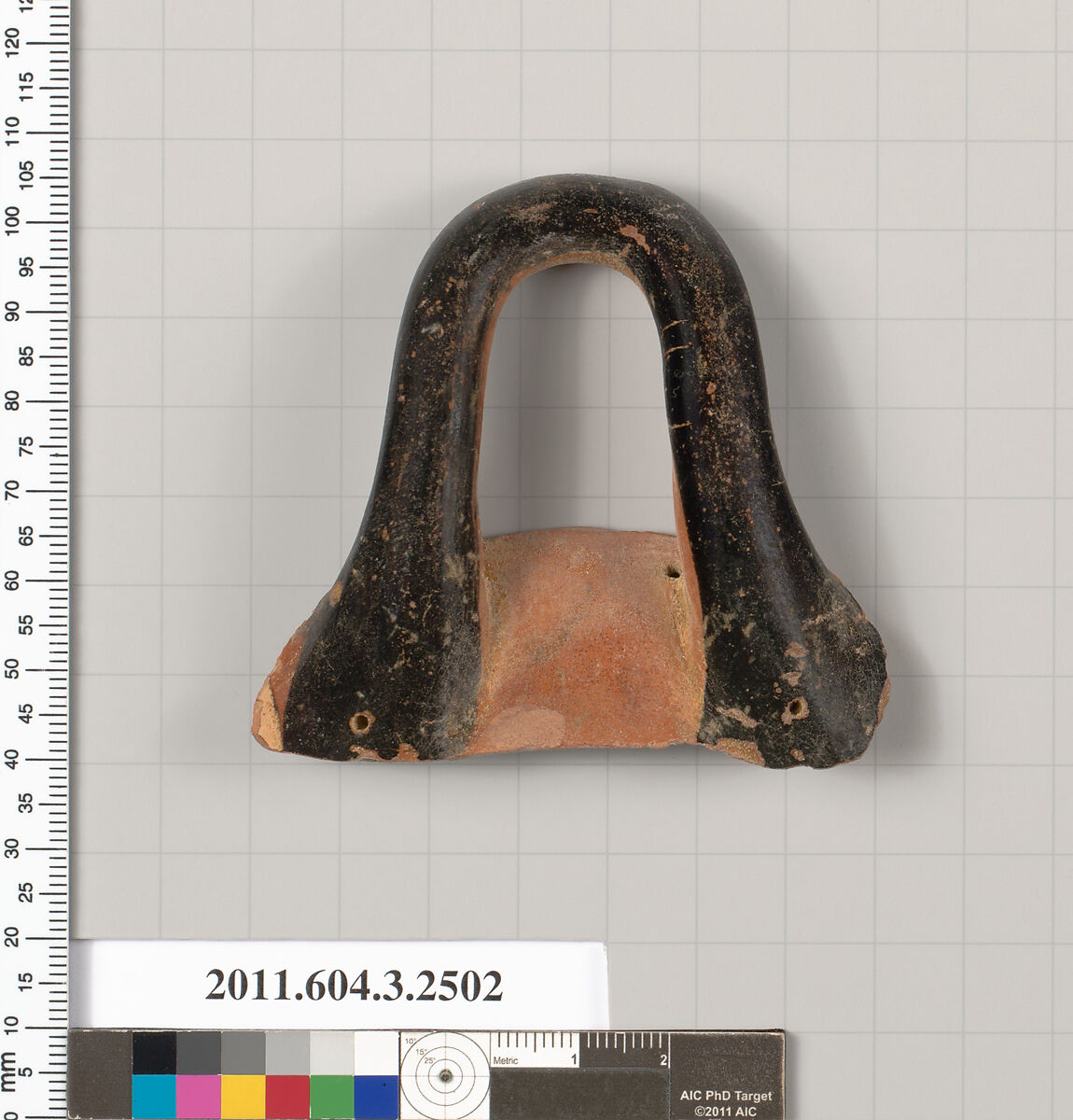 Complete kylix handle with part of the handle patch and four holes from an ancient repair
