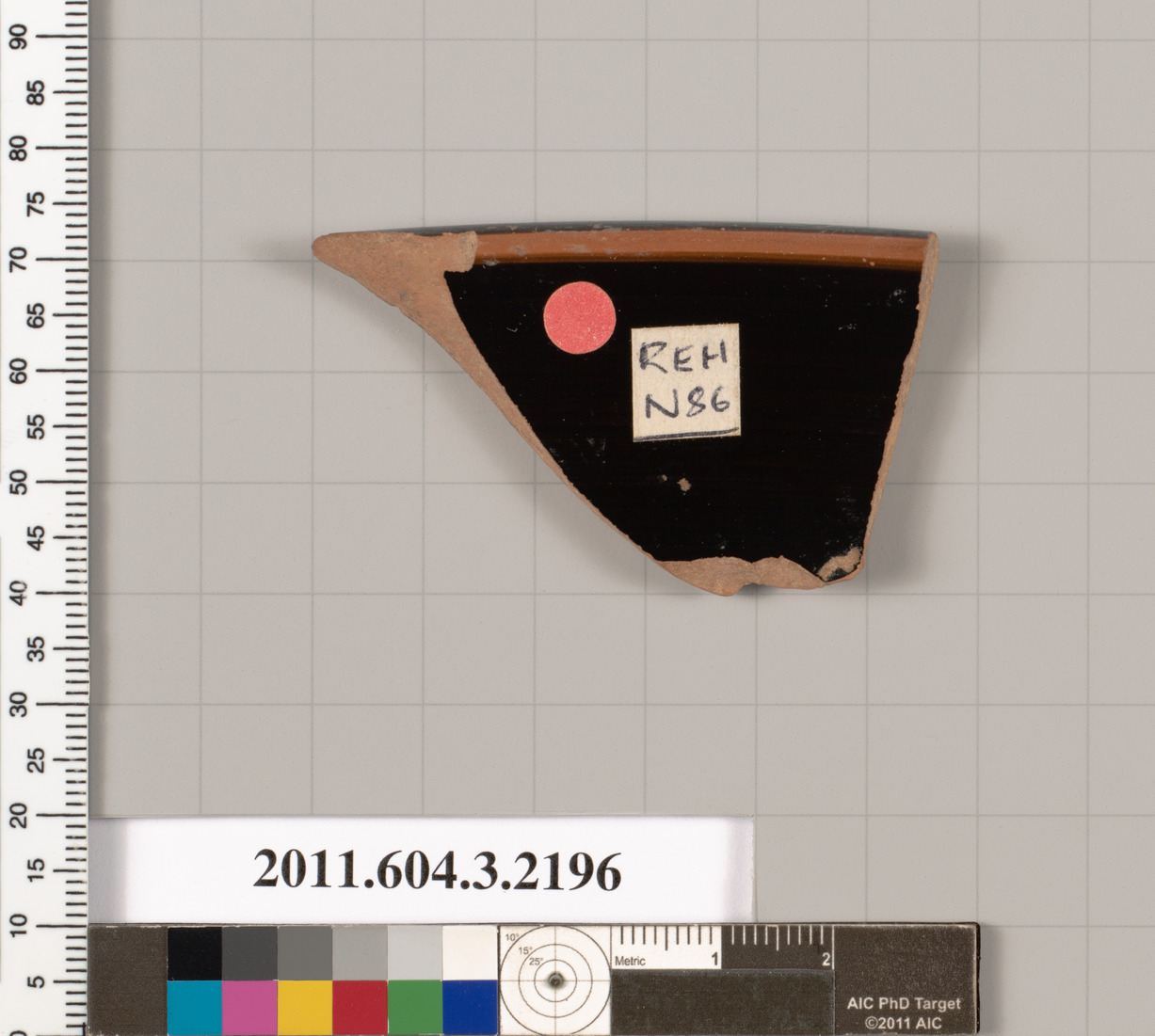 Exterior, at the rim, a thin black glazed line; reserved fragment with start of handle root