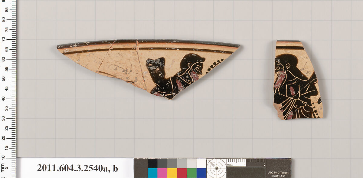 Exterior, the larger rim fragment has the head, neck, and upper torso of a bearded man to right, wearing a himation, holding a drinking horn; to the right, part of a vine; the smaller rim fragment has a bearded man to left, wearing a himation, with his left elbow seen from beneath the drapery, and his bent right arm in front of his chest, with part of the himation draped over the wrist; at the bottom right, part of a vine