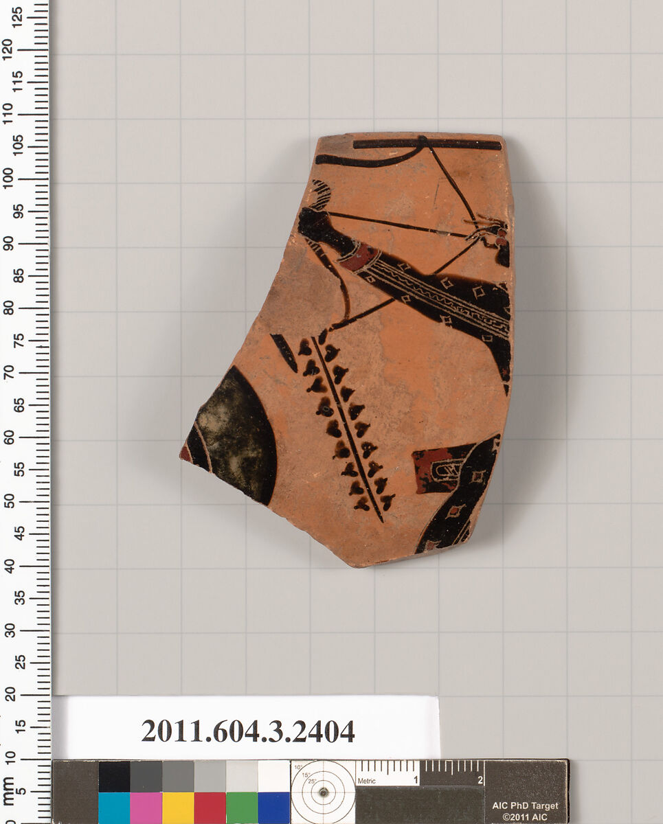Exterior, bit of the eyebrow and part of an eye; part of a vine; Scythian archer to left, drawing a bow
