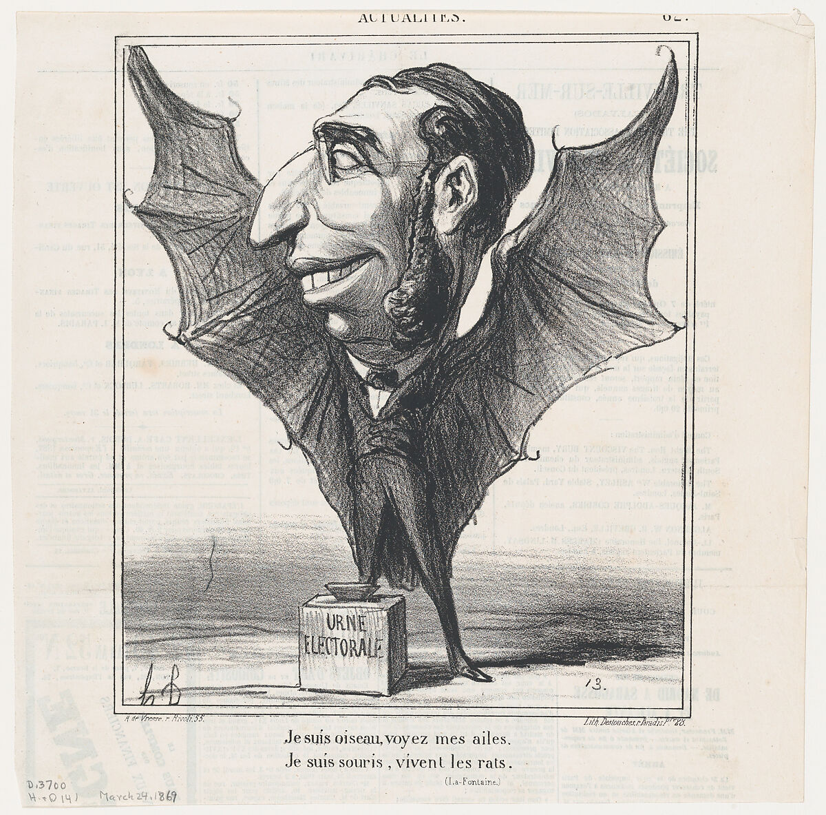 - Title: I am a bird, see my wings. I am a bat, long live the rats (La Fontaine), from 'News of the day,' published in Le Charivari, March 24, 1869