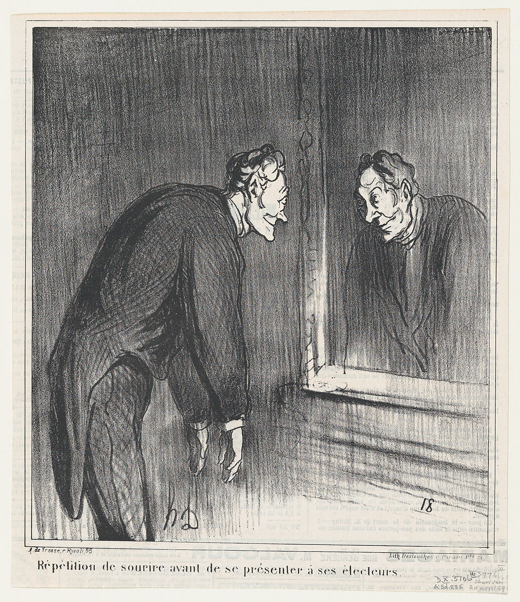 - Title: Rehearsing his smile before presenting himself to his constituency, from 'News of the day,' published in Le Charivari, April 20, 1869