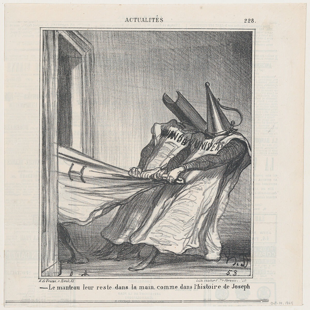The cloak remains in their hands, like in the story of Joseph, from 'News of the day,' published in Le Charivari, October 14, 1869