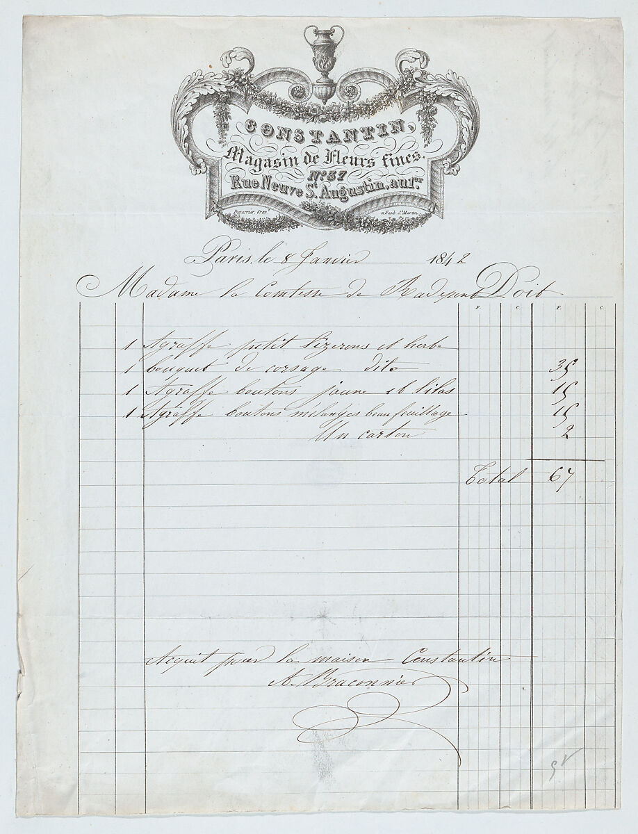 - Title: Invoice from Constantin Magasin de Fleurs fines, Paris, for plants and flowers