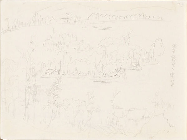 On this sheet, Xie's layering of the foreground, middle ground, and far distance may have been an attempt to construct a composition using the traditional "three distances." According to Xie's inscription, this is a view from the site of the former Leifeng Pagoda, which had collapsed in 1924, toward the island called "Reflections of the Moon in Three Ponds."