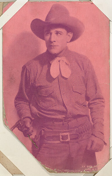 From Western Stars or Scenes Exhibit Cards series (W412). Distributed by Exhibit Supply Company of Chicago, Mutoscope or other companies. Postcard-sized thick card. Dispensed in arcade machines. Pink toned.