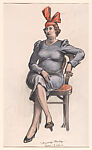 Depicted in color chalks is a formidable woman in a red hat and light blue dress sitting in a chair with her legs crossed. She turns to the side, avoiding the viewer’s gaze, a gesture that conveys a haughty attitude.