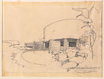 This sketch in soft graphite on transfer paper contains a perspectival view of Richard Neutra's design for the Cyclorama and Visitor's Center at Gettysburg, Pennsylvania. The Cyclorama, which also functioned as the visitor's center to the Gettysburg battle field area, was meant to house a 360-degree cyclorama that filled a drum of 80 feet in diameter with a depiction of the battle that took place in July 1863. Neutra was invited to design a building to house it, and began construction in 1958. While generally recognized as one on of Neutra's most important architectural designs, it was demolished in 2013 after the cyclorama itself had been removed for restauration work.