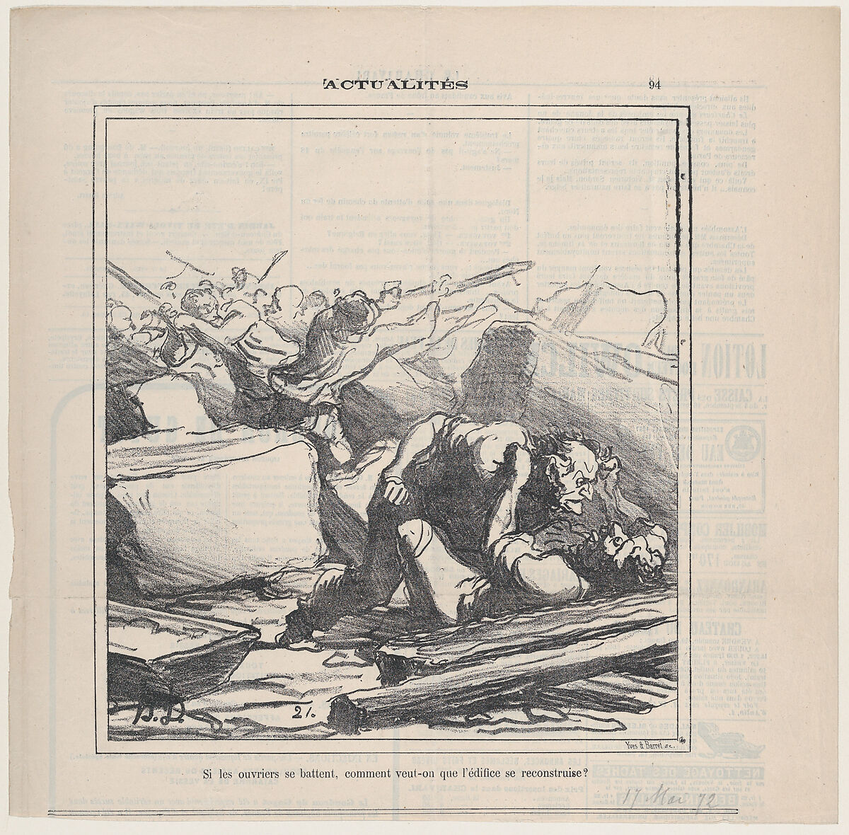 - Title: How can the building be restored if the workers are fighting between each other?, from 'News of the day,' published in Le Charivari, May 17, 1872