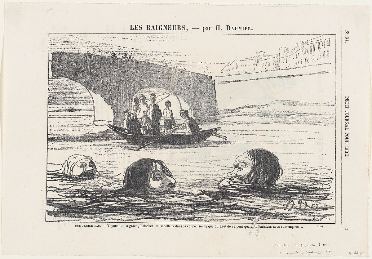 - Title: In the middle of the river: Come on, Balochet, give it a push!... You mustn't forget that some forty Parisians are watching us from the bridge up there!, from 'The bathers,' published in Le Petit Journal pour Rire, July 30, 1864