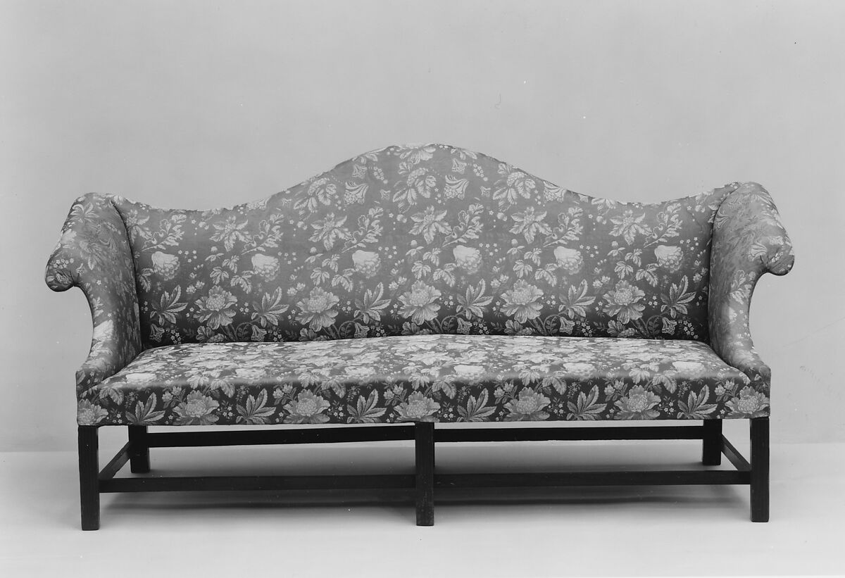 This sofa exhibits a graceful example of the classic Philadelphia camel-back form. The use of yellow pine and tulip poplar as secondary woods support an attribution to Philadelphia. The fluting on the legs of this sofa is highly unusual.